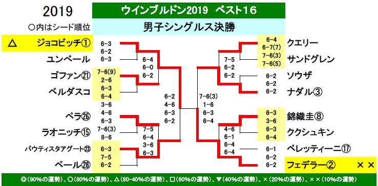 ウインブルドンテニス2019、男子決勝戦は第1シードのノバク・ジョコビッチ対第2シードのロジャー・フェデラーとなりました。
