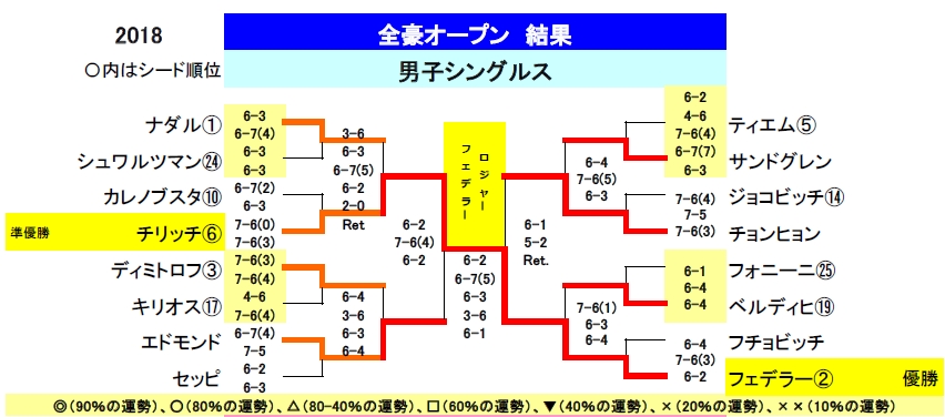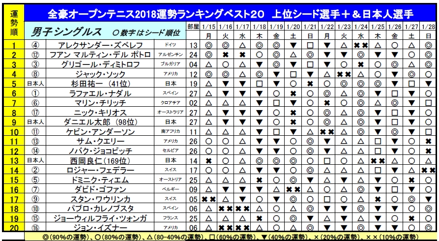 今年は優勝者当てクイズみたいな予想はやめて、上位シード選手+日本人選手20名を運勢の良い順にランキング形式で発表することにしました。