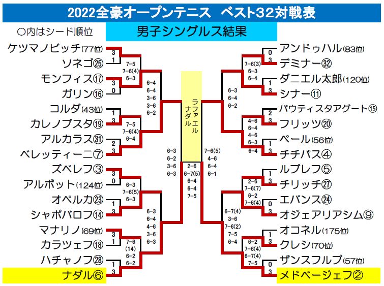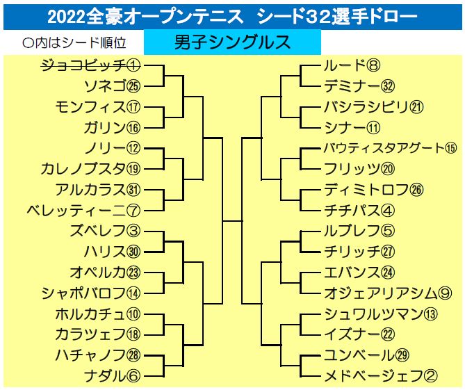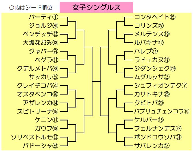 上位シード32選手が順当に勝ち上がった場合のドローは以下の通りでした。