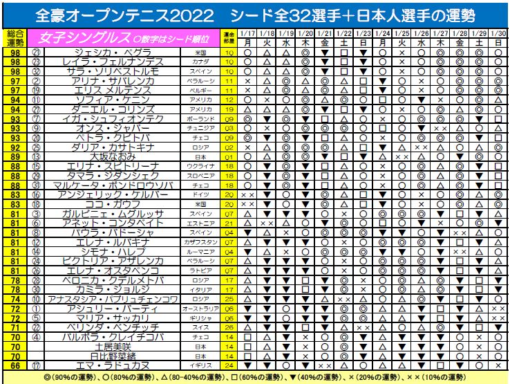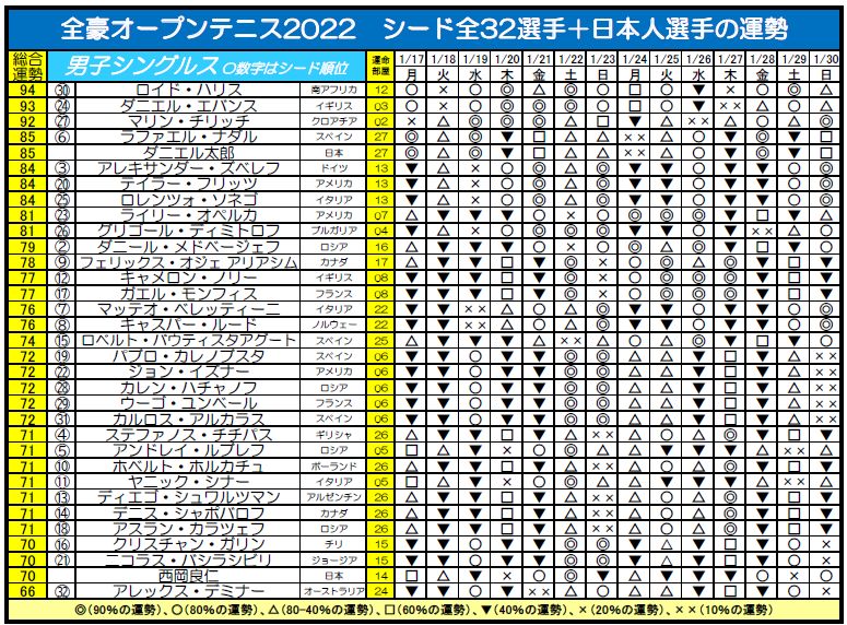 今回の全豪オープン2022も拡大版で、シード全32選手と日本人選手の運勢をすべて公開します。