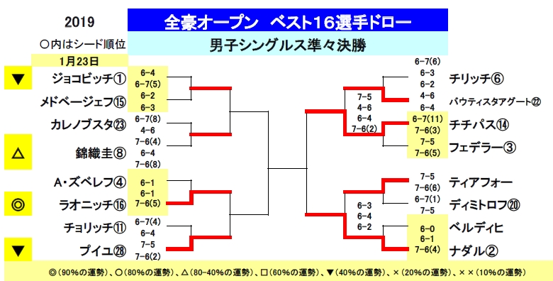 錦織圭△(80-40%の運勢)vsジョコビッチ▼(40%の運勢)