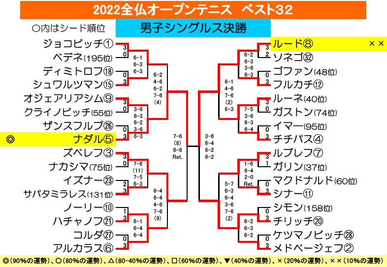 男子シングルス決勝はナダルが◎に対し、ルードが××運勢と明暗が分かれました。