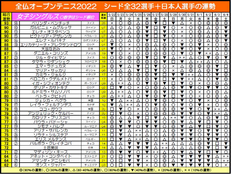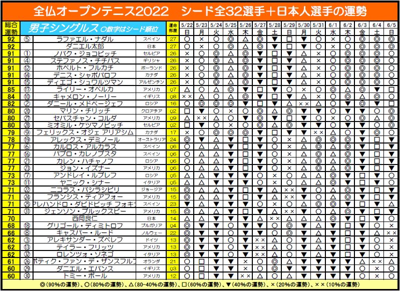 全仏オープン2022も拡大版で、シード全32選手と日本人選手の運勢をすべて公開します。