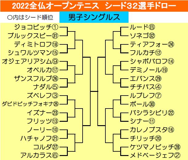 ドローが発表されシード32選手が順当に勝ち上がった場合の対戦は以下の通りです。