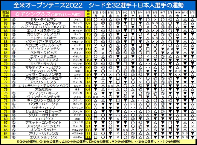 2022年はすべて拡大版で、シード全32選手と日本人選手の運勢をすべて公開します。