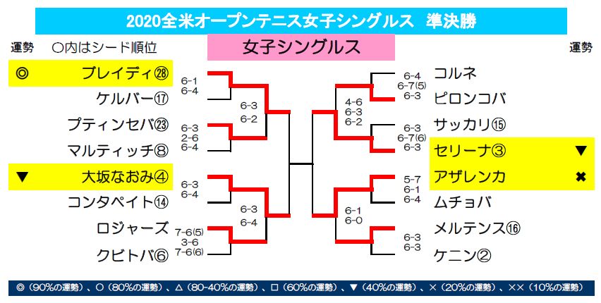 大坂なおみ(▼運勢)対ブレイディ(◎運勢)