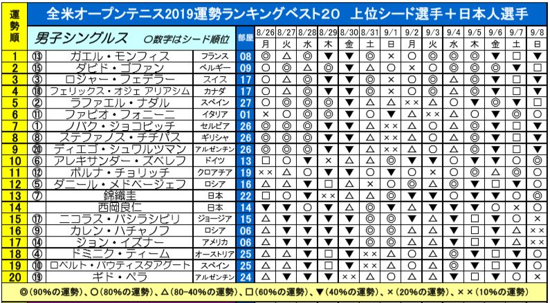 上位シード選手+日本人選手の計20名を運勢の良い順にランキング形式で発表しました。