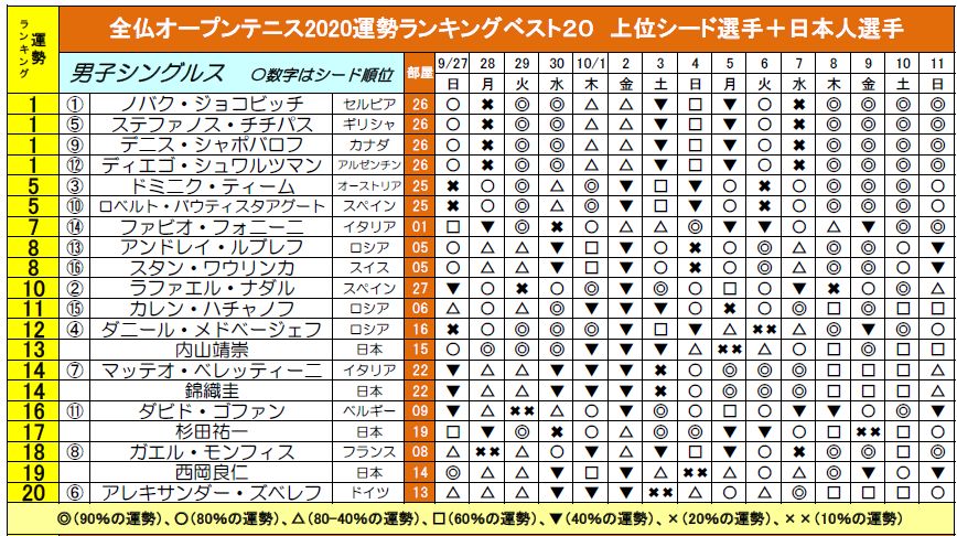 大会期間を通しての運勢ですが、第1位になったのは、男子:ジョコビッチ、女子:マルティッチです。