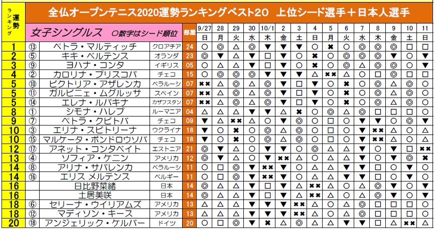 女子シード上位18選手+日本人選手2名の計20名をピックアップし、運勢の良い順にランキング形式で発表しました。
