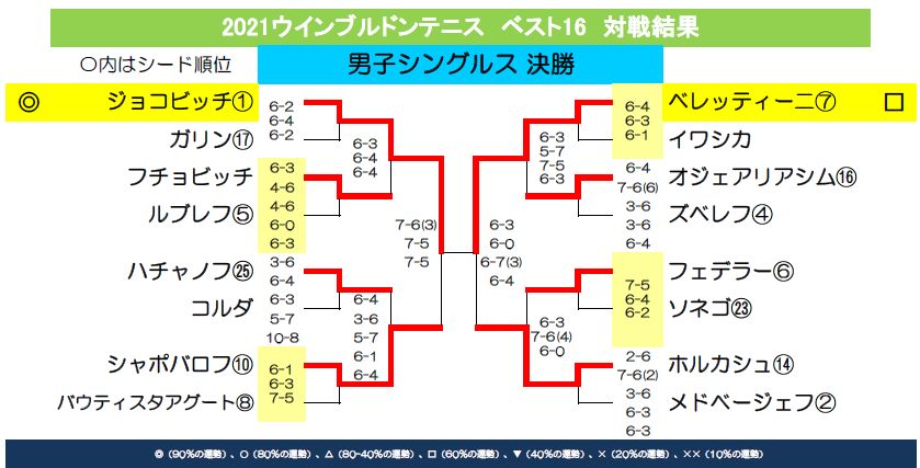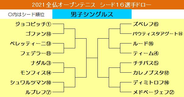 ドローが発表され上位16選手が順当に勝ち上がった場合の組み合わせは以下の通りです。