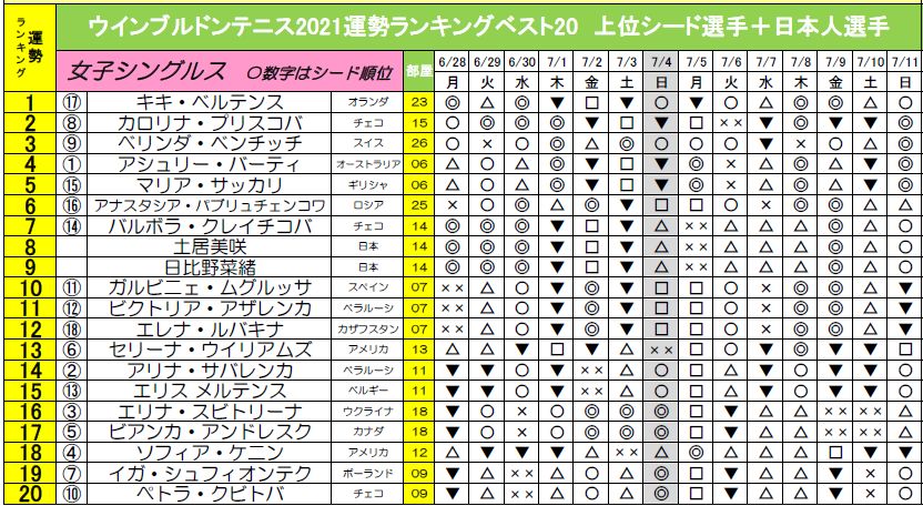女子シード上位18選手+日本人選手2名の計20名をピックアップし、運勢の良い順にランキング形式で発表しました。同じ部屋で同一順位の場合は世界ランキング上位の選手を上位にランクしています。