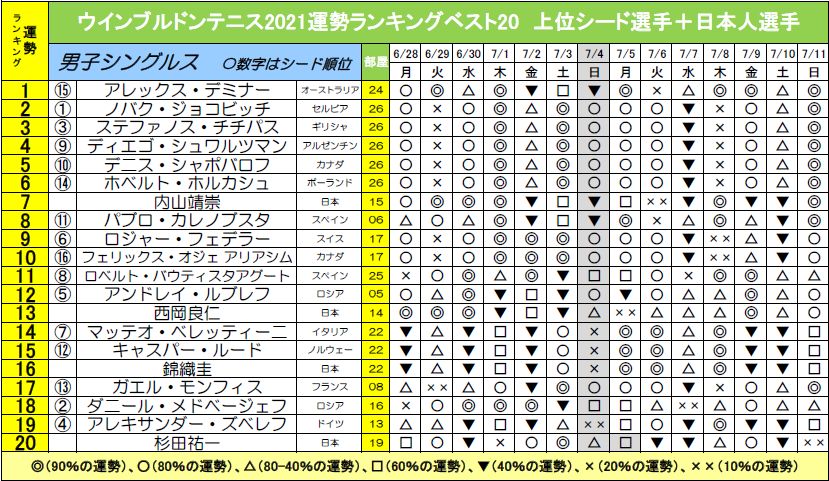 特にグランドスラムは1日おきに試合が組まれるので、試合のある日が良い運勢か悪い運勢かで大きく左右されるでしょう。さらにウインブルドンはミドルサンデー(今年は7月4日)が基本お休みなので、その日の運勢は記載していますが、ランキングからは除外してあります。