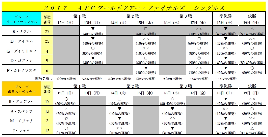 昨日はチリッチ(✖✖運勢)がフェデラー(△運勢)に第1セット奪いいい感じでしたが、逆転で負けで王者に屈しました。
