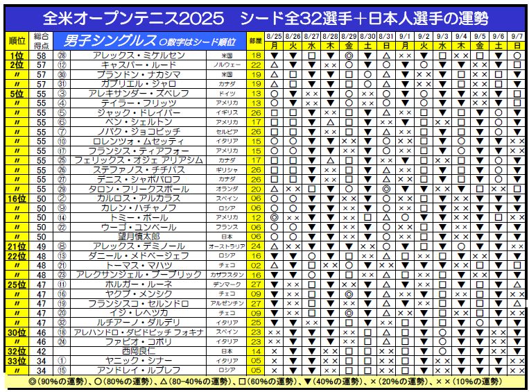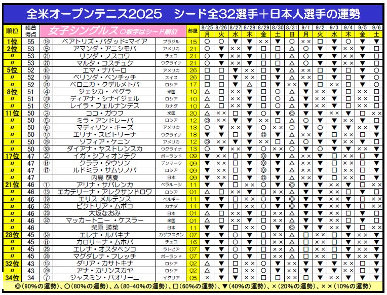 シード全32選手と日本人選手の運勢をすべて公開します。